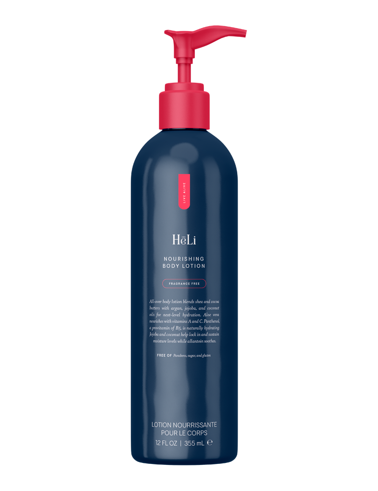 Take care of your skin with HēLi Nourishing Body Lotion. This aloe-based formula combines moisturizing argan oil with cocoa and shea butters in an all-over body cream made for head-to-toe hydration. Smooth this creamy, fragrance-free lotion over every inch of your body daily for skin that feels soft and nourished.