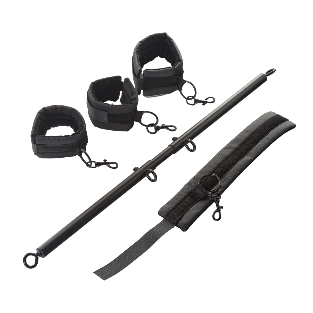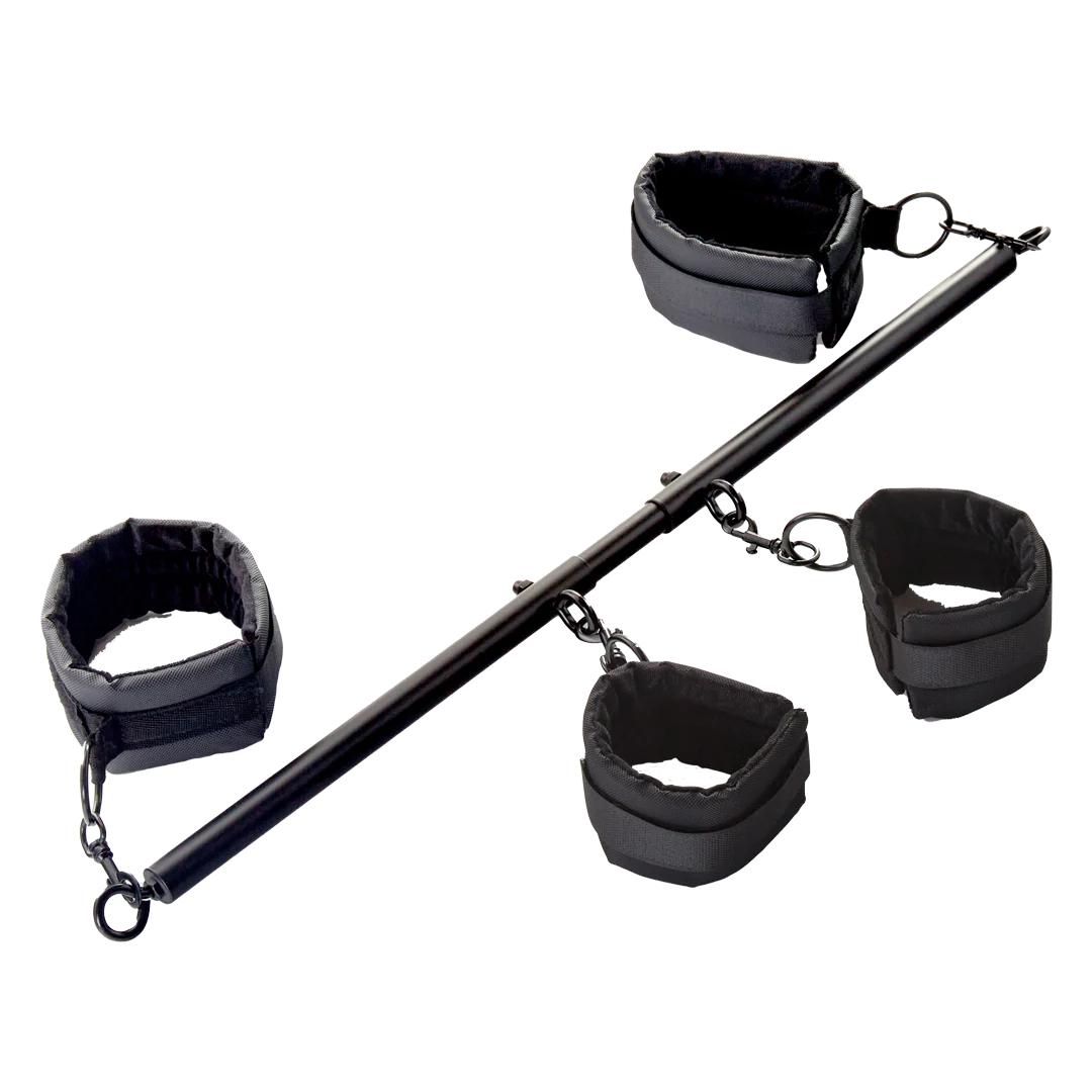 Entrégate a la lujuria y descúbrelo todo con este juego de manguitos y barra separadora. Los cuatro puños incluidos y la barra extensible permiten un control simple o una variedad de posiciones comprometidas.