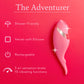 Encuentra el accesorio adecuado para ti: The Adventurer, una invitación exclusiva al placer. Este accesorio ideado por expertos te permite explorar nuevas dimensiones del deseo con diferentes tipos de estimulación del clítoris. Confeccionado en silicona de primera calidad, el detalle en dorado le aporta un toque de distinción, mientras que la forma redondeada se adapta perfectamente a la mano. Deja que el extremo texturizado te seduzca con múltiples velocidades y patrones de vibración o ajusta la apertura del accesorio alrededor del clítoris para obtener una presión de aire que te dejará sin aliento.