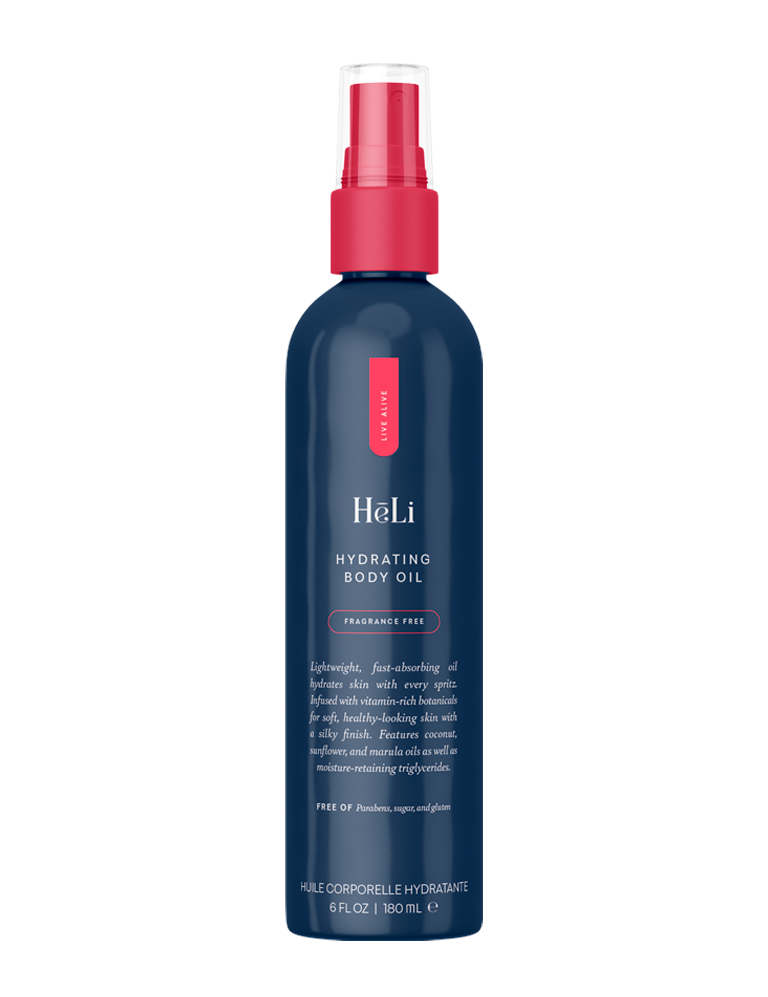 Conserva la humedad con el HēLi Hydrating Body Oil, una fórmula no grasa de rápida absorción que mantiene tu piel espléndidamente hidratada con cada aplicación. Inspirado por la naturaleza, nuestro aceite corporal está cargado de ingredientes botánicos ricos en antioxidantes y vitamina E. Otros ingredientes incluyen los naturalmente hidratantes aceites de coco, de girasol y de marula, un botánico que tiene un alto contenido de ácidos grasos esenciales para una piel sana. Aplica después del baño o de la ducha para darle a tu piel un acabado suave y sedoso.