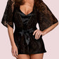 Cuando se pone el sol, es hora del romance y de Twilight. La bata de encaje floral negro se mantiene cerrada con un lazo sedoso que pide ser desabrochado. Abre la bata y deja al descubierto el babydoll de charmeuse con corte al bies con tiras ajustables entrecruzadas, una espalda baja sexy y terminación con aberturas laterales.